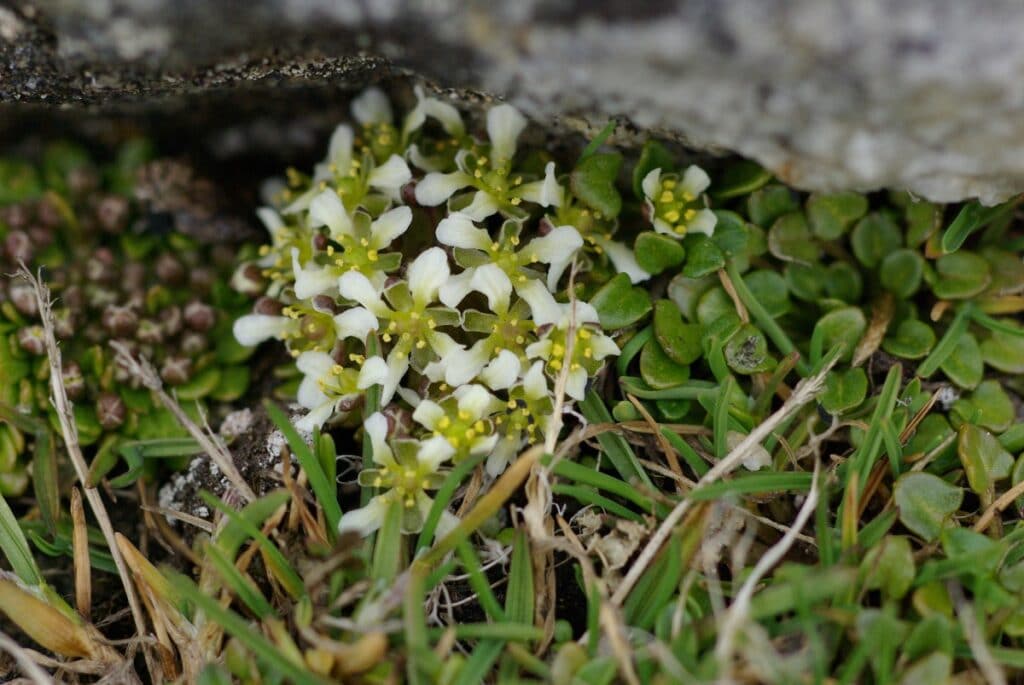 Das Löffelkraut ist eine zweijährige Pflanze, die ungefähr 20 bis 40 Zentimeter hoch wird, wenn man sie bei uns einpflanzt. In Spitzbergen ist sie in der Regel wenige Zentimeter flach – außer man sucht unter sehr nährstoffreichen Vogelfelsen, wo alles Grünzeug sehr gut gedüngt wird. Löffelkraut heißt es natürlich wegen seiner Blätterform. Sie sind glatt und dunkelgrün – und geformt wie kleine Löffelchen.