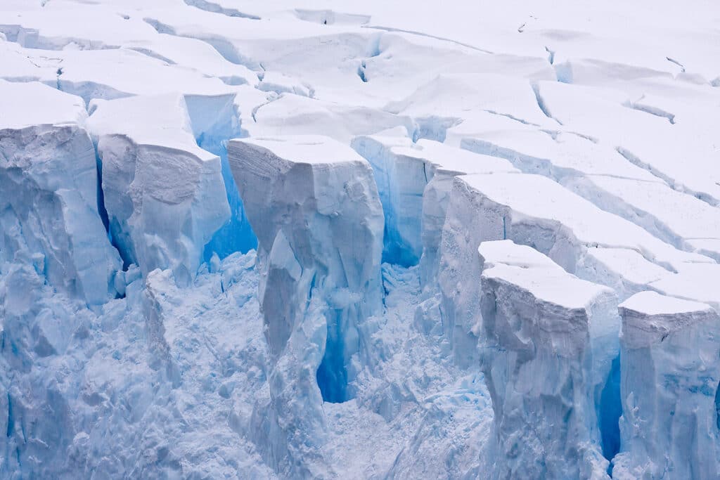 Dann schauen wir uns den Begriff „kollabieren“ an: Dass Eisberge von Eisschelfen abbrechen, ist ein normaler Vorgang, ab einer bestimmten Ausdehnung brechen die Eismassen ab, das Schelf kalbt, wie man das auch von Gletschern kennt. Was nicht normal ist, ist das Zerbrechen der gesamten Eisplatte und sein Ablösen vom Inlandeis. Dann spricht man von Kollabieren. Hinterher ist nichts mehr da, das Schelfeis ist weg.