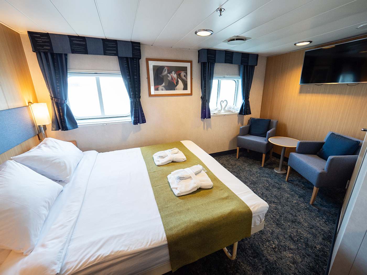 Alle 26 Kabinen sind Außenkabinen mit eigenem Bad und Fenster. In jeder Kabine findet sich ein Schreibtisch mit Stuhl und ein Schrank zur Aufbewahrung. Die Kabinen verfügen über ausreichend Staumöglichkeiten für Kleidung und Ausrüstung während der Reise. Stromanschluss in allen Kabinen: Euro-Stecker mit 220 V.